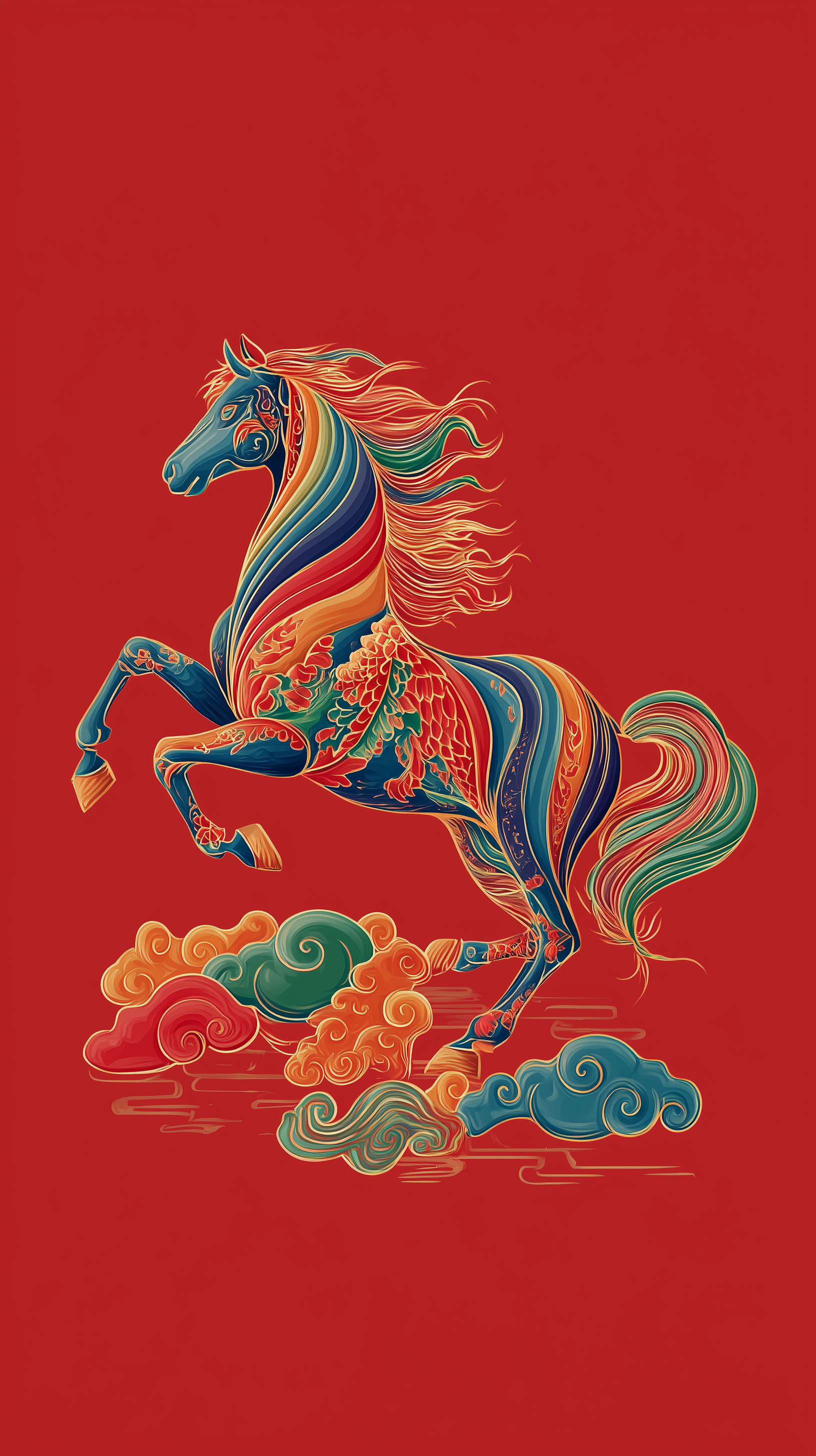史诗般的马从天而降,动态的运动模糊的踪迹,优雅的流动线条连接到底部的马尾,丰富的红色背景,中国风格,获奖平面矢量插图,马的身体在红,蓝,绿,黄,装饰吉祥的云和传统的中国图案,优雅的姿态,干净的设计,高细节,风格化,鲜艳的色彩,极简的构图