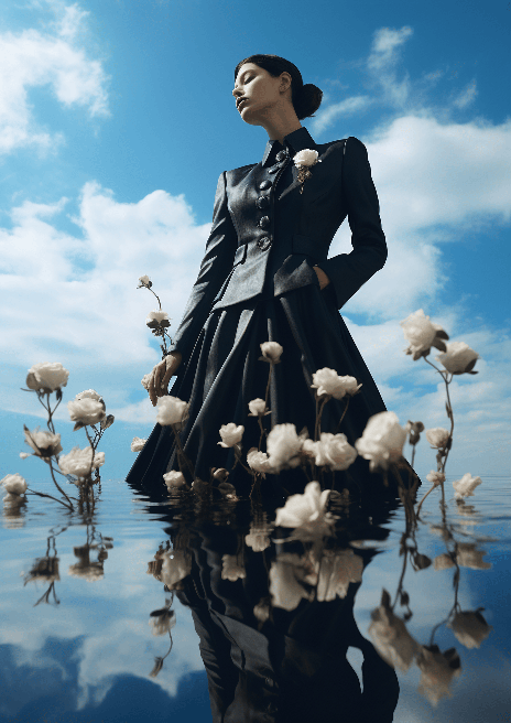 A high fashion model in an unconventional Yves Saint-Laurent outfit, her silhouette reflected on the mirror-like surface of a serene lake, under a sky filled with floating, oversized roses. Low angle view for Esquire, by Bella Kotak --ar 5:7 --s 250 --style raw --v 6.0