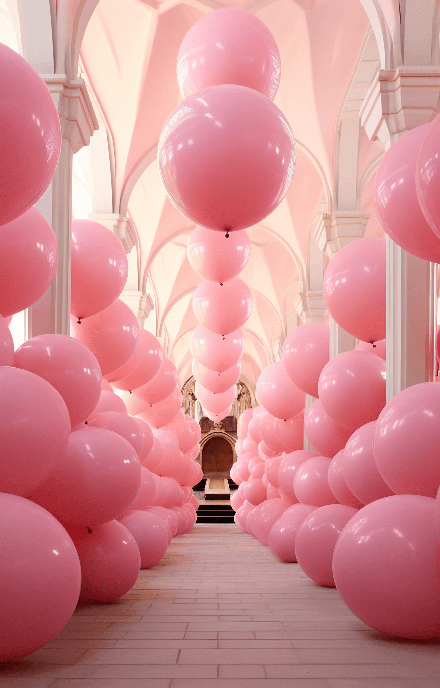 Envision an indoor photography of a labyrinth of monumental, inflated pink balloons, an art installation by Martin Creed. This high-quality 16K 3D art shot captures the overwhelming, yet playful atmosphere. --ar 9:14 --s 250 --style raw --v 6.0