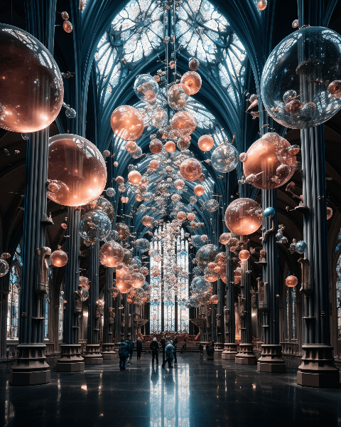 A futuristic cathedral with stained glass windows depicting scenes of space exploration Composition: A low-angle shot, emphasizing the grandeur of the cathedral, in the style of Hiroshi Sugimoto's architectural photography --ar 4:5 --s 250 --style raw --v 6.0