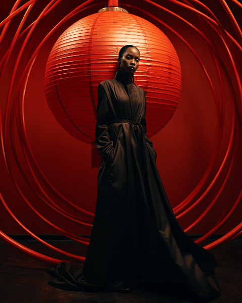 A model posing dynamically in a high fashion outfit inspired by the modern interpretation of the Chinese dragon, set against the backdrop of a Chinese lantern-lit pavilion. Ultra-wide angle, for W Magazine, shot by Rick Owens. --ar 4:5 --s 250 --style raw --v 6.0