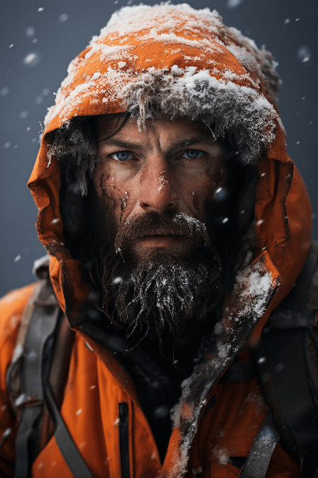 Picture a lone explorer amidst the white expanse of the Antarctic, wrapped in weathered, heavy-duty gear. His expression is one of determination against the biting cold, his stance strong against the blizzard. Capture this moment in a wide view, mirroring the vast emptiness around him, in the style of Akos Major's minimalist and dramatic landscapes. --ar 2:3 --s 250 --style raw --v 6.0
