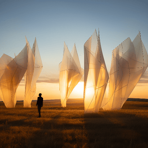 A vast prairie transformed into a garden of giant, wind-powered kinetic sculptures, creating a mesmerizing dance of shadow and light, masterminded by Bjarke Ingels. A wide view captures the scale and synchrony of these moving structures at sunrise --ar 1:1 --s 250 --style raw --v 6.0