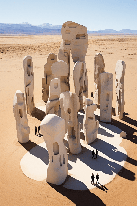 A vast desert featuring monumental stone sculptures, blending seamlessly with the arid landscape, imagined by Michael Graves. An aerial view reveals the magnitude of the sculptures, mirroring ancient mythological figures, with a lone explorer for scale --ar 2:3 --s 250 --style raw --v 6.0