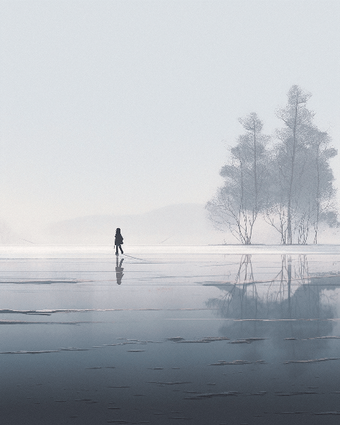 A peaceful winter morning, a lone figure ice-skating on a frozen lake, rendered in the style of Alec Soth. The extreme close-up captures the skater's concentration and the icy surface below, contrasting with the soft, distant snow-covered trees --ar 4:5 --s 400 --niji 5