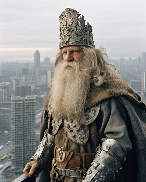 In a wide view, witness a Viking warrior standing in awe of modern cityscape, his traditional attire clashing with the skyscrapers The surreal scene, rendered in photorealistic detail, brings a time-travel story to life by Martin Parr --ar 4:5 --s 250 --style raw --v 6.0
