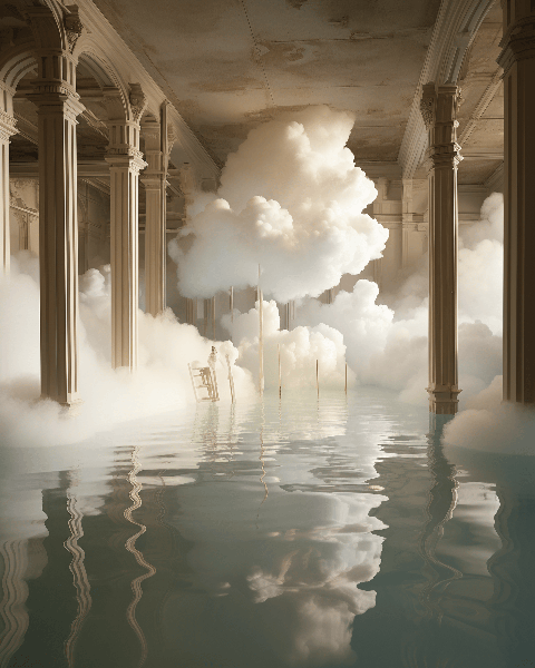 Imagine a 16K, ultra-detailed photography of a floating city installation by Berndnaut Smilde. Cotton clouds drift within an indoor Victorian-style room. The scene, captured from a slight low angle, creates a dreamlike atmosphere. --ar 4:5 --s 250 --style raw --v 6.0