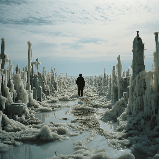 In a surreal landscape, find a cotton tombstone telling a tale of life and death The wide view showcases the scene in a positive light, where Kodak film techniques add unique texture by Andreas Gursky --ar 1:1 --s 250 --style raw --v 6.0