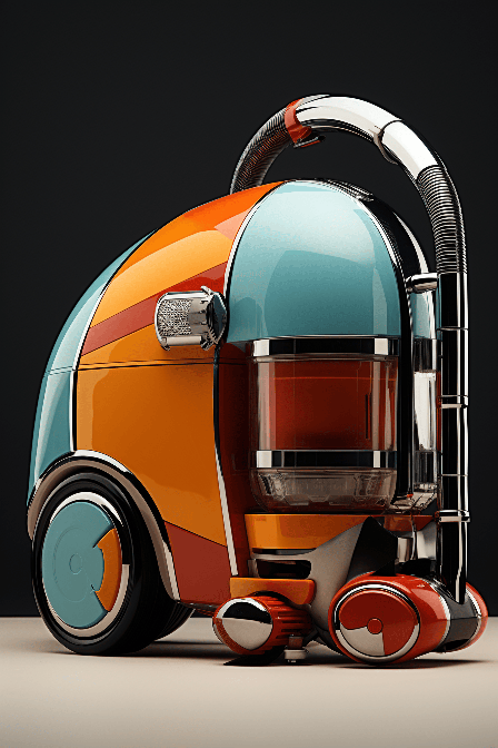 Echoing Frame Magazine, picture a futuristic vacuum cleaner. The vacuum cleaner features a bold color block design, offering an industrial look with a modern twist. The Memphis design style is evident, captured in a 3D render, showcasing the vacuum's vibrant colors and unique shape in UHD --ar 2:3 --s 250 --style raw --v 6.0