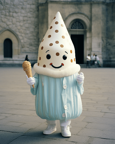 Random incroyable italian ice cream costume, photography of random inflatable ice cream, 35MM, film, portrat 400, grain, , very old, vintage pictures --ar 4:5 --s 250 --style raw --v 6.0