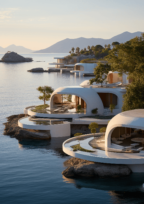 A series of floating islands with sprawling Greek-style white stone villas, designed by David Chipperfield. A wide view captures the idyllic scene, each island casting a mirror image on the azure waters against a golden sunrise --ar 5:7 --s 250 --style raw --v 6.0