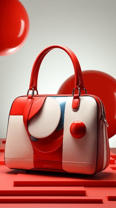 A handbag with an inflatable bag concept and a modern, bold texture is envisaged. It features a creative styling reminiscent of the Red Dot Design Awards. Captured in a hyper-realistic 3D render, the design's bold color blocks and texture-rich surface are depicted in extraordinary detail. --ar 9:16 --s 250 --style raw --v 6.0