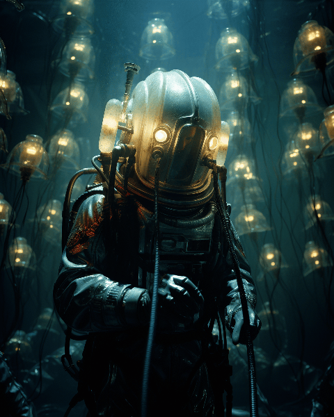 A portrait of a deep-sea diver in vintage gear by Tim Walker, surrounded by a swarm of glowing jellyfish in the alien ocean. --ar 4:5 --s 250 --style raw --v 6.0