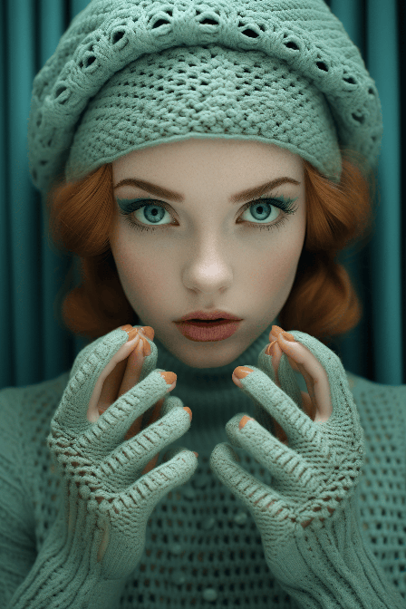 A girl wearing gloves and a hat, in the style of mitch griffiths, fay godwin, dora carrington, wes anderson, minolta riva mini, silence, neo - traditionalist, woven/ perforated --ar 2:3 --s 250 --style raw --v 6.0