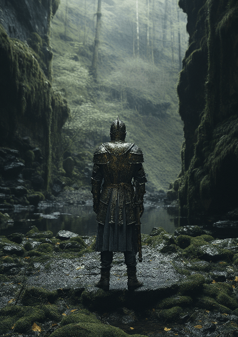 A knight from a medieval fantasy realm stands in quiet contemplation before a foreboding, dark forest. His armor is worn but undaunted, his expression stern yet resolved, captured in a full body shot that mirrors the compelling narrative quality of Andreas Gursky. --ar 5:7 --s 250 --style raw --v 6.0