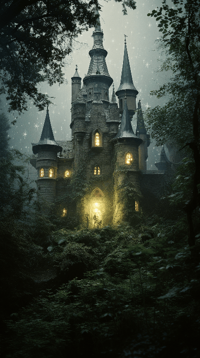 A fairy-tale castle hidden in the depths of the enchanted forest. Composition: The castle is framed by overgrown foliage, its turrets reaching towards a sky filled with twinkling stars, by Alec Soth --ar 9:16 --s 250 --style raw --v 6.0