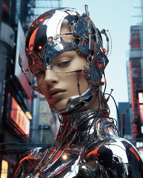 A portrait of an android woman in a metallic, avant-garde outfit by Alexander McQueen, her face reflecting the glow of neon city lights. Capture her contemplative expression in the style of Martin Schoeller's detailed portraiture. --ar 4:5 --s 250 --style raw --v 6.0