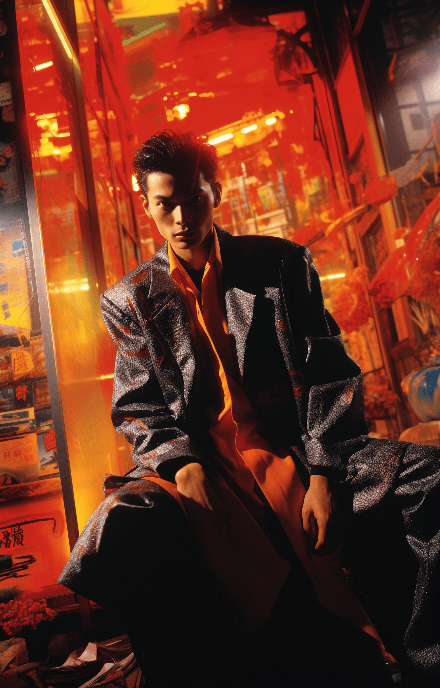 Imagine a model draped in a modern interpretation of traditional Chinese silk by Bottega Veneta, standing amidst a cityscape lit by neon lights. This low angle view for GQ, captured by Bert Stern, paints a picture of the old in the new --ar 9:14 --s 250 --style raw --v 6.0