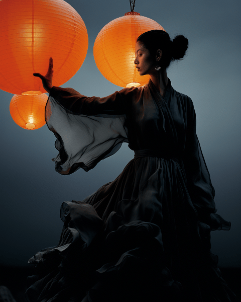 A model in a flowing gown by Giorgio Armani gracefully dances with a Chinese lantern, illuminating the night sky. Half body shot, for Harper's Bazaar by Nadav Kander, showcasing the enchanting essence of Chinese folklore. --ar 4:5 --s 250 --style raw --v 6.0