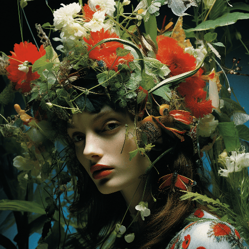 Close up of a high-fashion model wearing a floral headpiece designed by Gucci, the intricate flowers mirroring the vibrant blooms around her in a lush forest glade. Shot for Elle by Andreas Gursky, this scene echoes the enchanting beauty of nature --ar 1:1 --s 250 --style raw --v 6.0