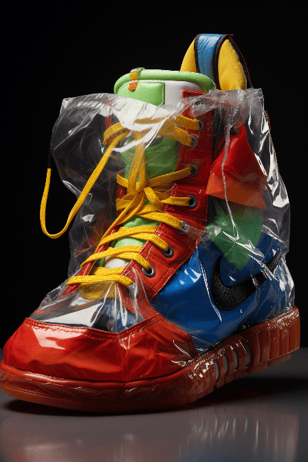 An nike sneaker,claes oldenburg, nike, muppet wearing plastic toys collection, oversized inflatable inflated puffer trousers made of transparent fabric, transparent vinyl plastic raincoat, patchwork, bathtowel, statement, collection of logos, nike, luis vuitton, off - white, balenciaga, anti design, bar code, graphic design by cecile roger, cover art, cover text, font, graffiti, holographic, album cover, in - action, volumetric lighting, PhotoReal, square ratio, golden ratio haute couture, harajuku knitwear, clear holographic iridescent wool, pink clear transparent wool, on the children room floor, bokeh blur, pixar fur, Holographic, glitter, plastic, kawaii, hyperrealistic 3d render, Isd, vibrant retro pastel colors, octane render, 3D extruded sticker, in - action, 3d render, studio lighting, dripping oil paint, key visual --ar 2:3 --s 250 --style raw --v 6.0