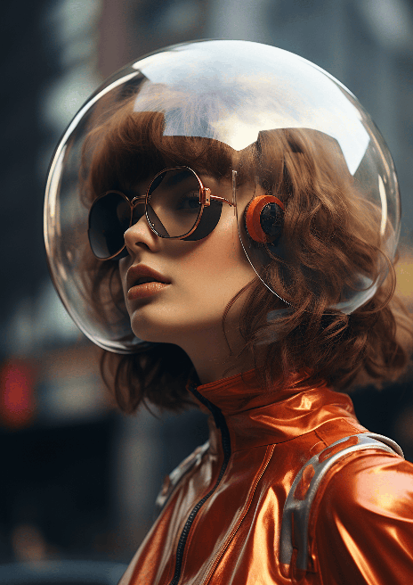 Profile shot of a city dweller in the Future Metropolis, styled as a 1970s minimalistic photograph. The subject, a woman in a bubble helmet, exhibits a strong character design, reminiscent of retro sci-fi films. Her fashion-forward attire is a mix of old and new, her expression one of determination and hope. The backdrop of the city's dazzling neon lights and towering skyscrapers completes this photorealistic, cinematic portrait. --ar 5:7 --s 250 --style raw --v 6.0