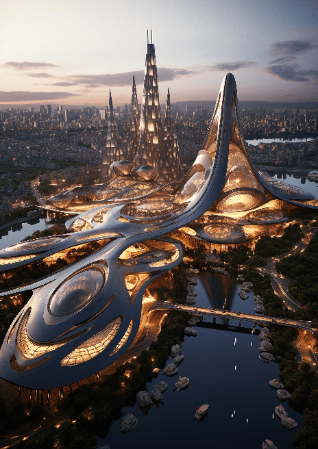 A breathtaking panorama of a future metropolis envisioned by Zaha Hadid. The city is dominated by fluid, curved structures mirroring the organic forms found in nature. An extra-long shot captures this harmonious blend of architecture and natural inspiration at dusk --ar 5:7 --s 250 --style raw --v 6.0