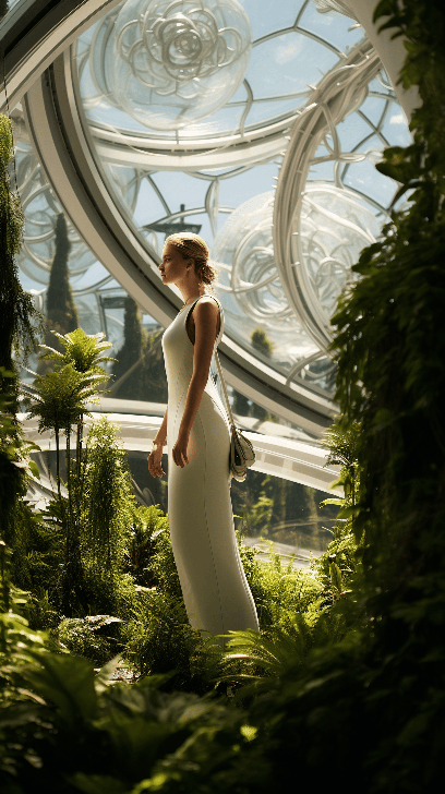 A high fashion model, dressed in Chanel, stands in a futuristic garden, lush with genetically modified, vibrant plants. Wide view, for AnOther by Alan Schaller. --ar 9:16 --s 250 --style raw --v 6.0