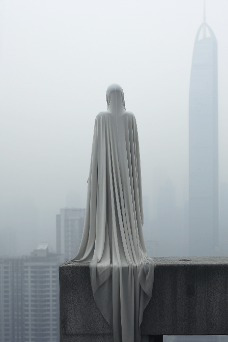 A high-fashion model in a sleek, futuristic attire by Rick Owens, seeming to phase through the walls of a minimalist, monochromatic cityscape. Captured in a wide view for AnOther by Akos Major --ar 2:3 --s 250 --style raw --v 6.0