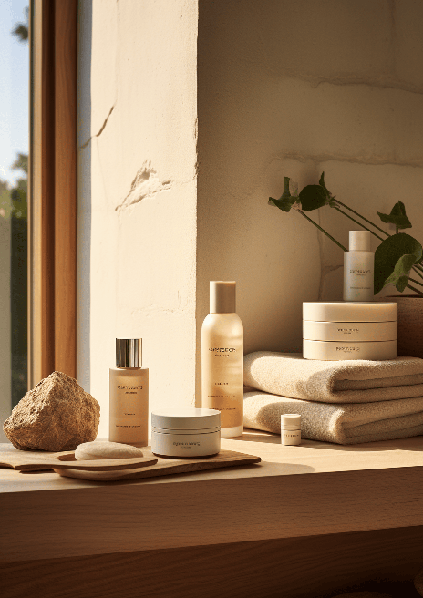 Envision a skin care product line-up in a setting that's reminiscent of a peaceful morning in a minimalist Scandinavian home. Natural light filters in, casting a warm, welcoming glow on the assortment of items. The products have a simple design and are made of transparent materials to showcase their purity. In ultra-high definition, every aspect from the light reflecting off the clean, glass surfaces to the gentle ripple of the liquid within is captured in precise detail --ar 5:7 --s 250 --style raw --v 6.0