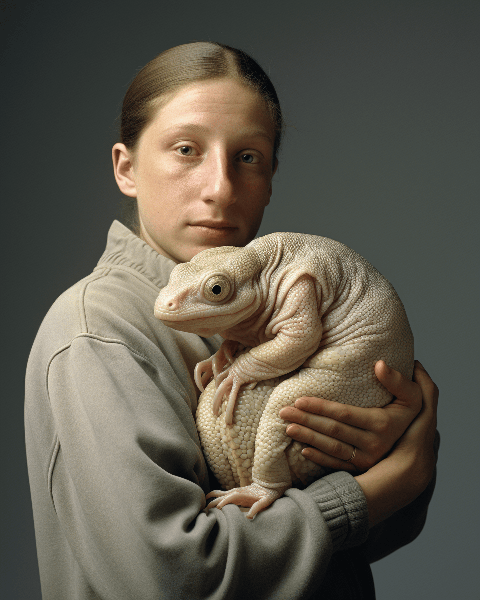 A hyperrealistic installation by Patricia Piccinini that portrays an uncanny, artificial creature tenderly cradling its young in an indoor setting. This 16K photography draws attention to the eerily detailed features, seen from a slightly lower perspective. --ar 4:5 --s 250 --style raw --v 6.0