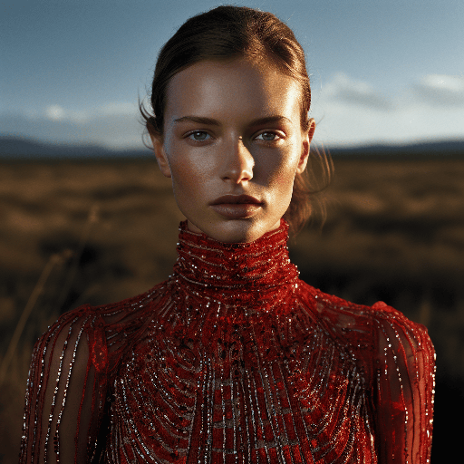 Close up of a model in a Dior dress, the intricate red beadwork catching the glow of the setting sun in a rural landscape dominated by red clay. Captured for Elle by Andreas Gursky, this image highlights the power of a single color --ar 1:1 --s 250 --style raw --v 6.0