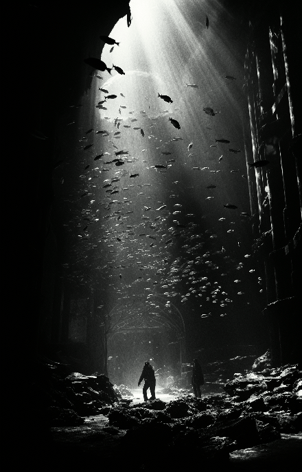 A scene of alien fish swimming through the ruins of a sunken spacecraft, captured in the black and white style of Daido Moriyama. --ar 9:14 --s 250 --style raw --v 6.0