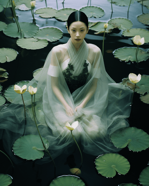 A high-fashion model floats gracefully in a tranquil lotus pond in a chic Hanfu by Yves Saint-Laurent. The image, shot from a top view for AnOther Magazine by Tim Walker, presents a mesmerizing tableau of beauty and tranquillity. --ar 4:5 --s 250 --style raw --v 6.0