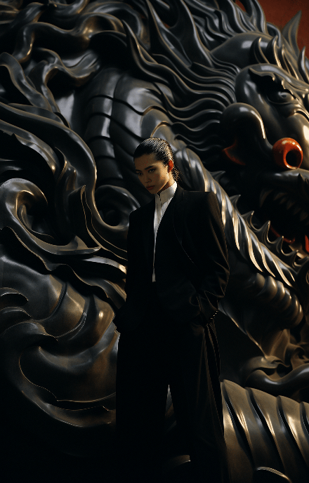 A model in a dynamic pose, dressed in a sleek ensemble by Chanel, with a majestic Chinese dragon in the backdrop. Profile shot, for GQ by Edward Burtynsky, capturing the folklore's grandeur. --ar 9:14 --s 250 --style raw --v 6.0