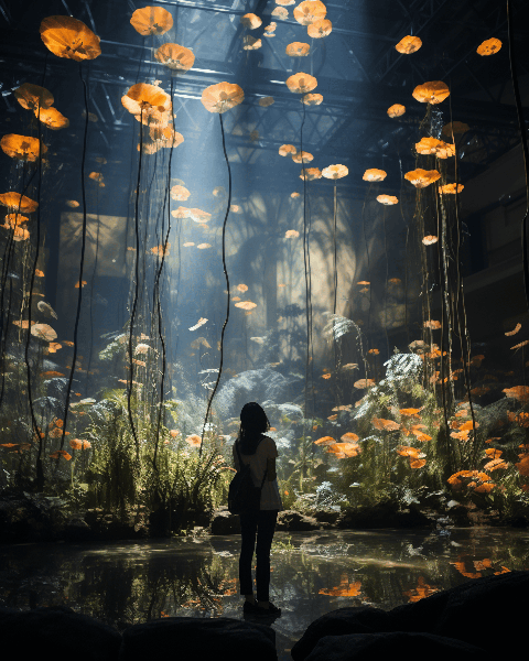 Visualize a 3D art by Cai Guo-Qiang. An indoor botanical garden at midnight, lit by an array of floating lanterns. High-quality 16K photography captures the interplay of shadows and the mysterious ambiance created by the flickering lights. --ar 4:5 --s 250 --style raw --v 6.0