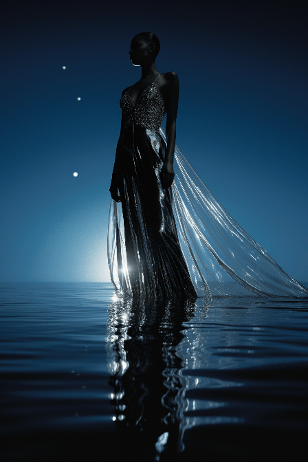 Extra long shot of a model in a reflective Prada outfit, her form blending with the shimmering surface of a calm lake under the moonlight. Captured for Vanity Fair by Albert Watson, this image portrays the tranquil beauty of the night --ar 2:3 --s 250 --style raw --v 6.0