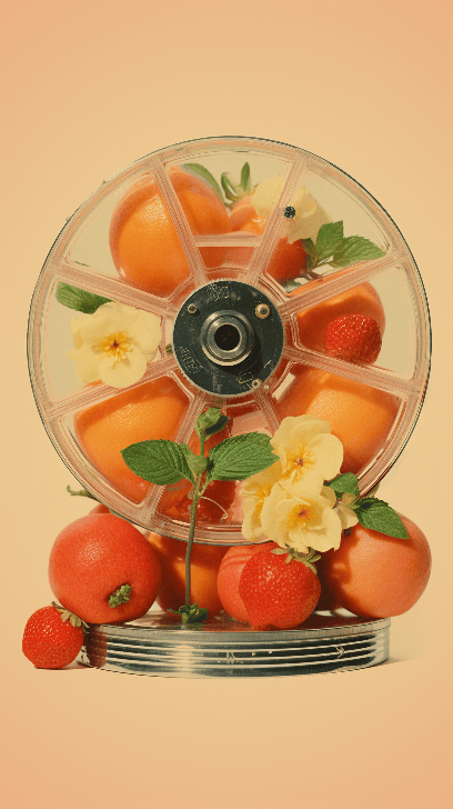 An image of a peach, an orange, and a strawberry, each with a film reel superimposed on it. --ar 9:16 --q 5 --s 250 --style raw --v 6.0
