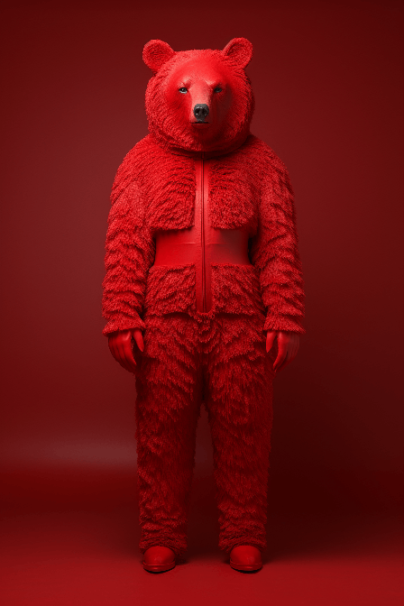a model wearing a red bear costume standing in a red area, in the style of rendered in cinema4d, mcdonaldpunk, petrina hicks, bold black outlines, macro zoom, mommy's on-the-phonecore, animated gifs --ar 2:3 --chaos 25 --s 250 --style raw --v 6.0