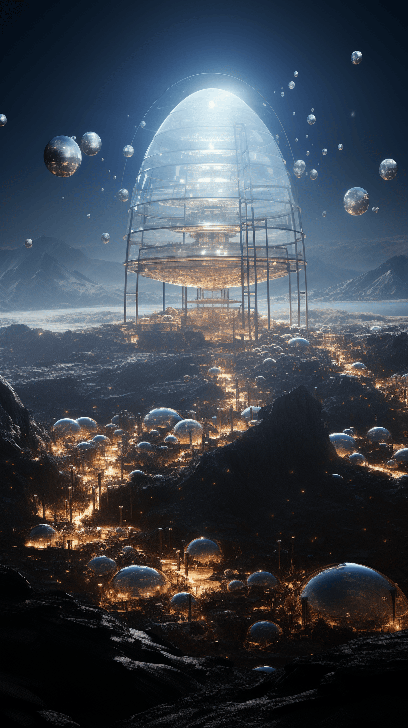 A lunar colony in the style of Michael Wesely's long-exposure photography. Capture the dome-shaped habitats, towering antennas, and astronauts against the backdrop of a starry sky and Earth in the distance. --ar 9:16 --s 250 --style raw --v 6.0