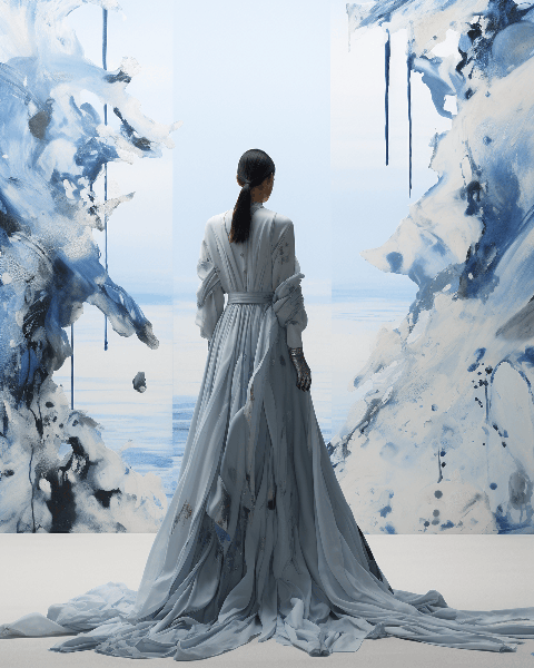 Embark on a journey through time to the year 2023 with a high-fashion model showcasing the minimalist designs of Dior. The model, in an expressive pose, stands tall against a panorama painting backdrop. Full body shot, Vogue, by Nick Knight --ar 4:5 --s 250 --style raw --v 6.0