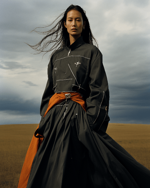 A model, in a chic Balenciaga outfit, embodies the generosity of Sagittarius. Extra long shot, for Madame Figaro, with an archer subtly incorporated into the background, captured by Jamie Hawkesworth. --ar 4:5 --s 250 --style raw --v 6.0