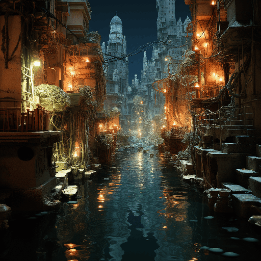 A hyperrealistic image of an underwater city, as seen through the lens of Edward Burtynsky. Capture the vibrant coral architecture, bioluminescent street lights, and aquatic citizens. --ar 1:1 --s 250 --style raw --v 6.0