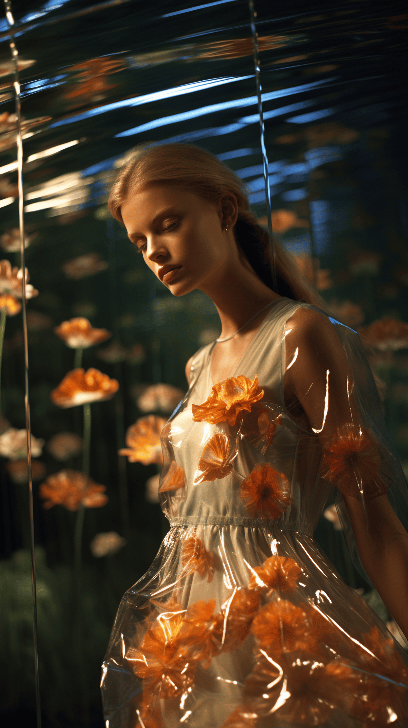 A model in a diaphanous Louis Vuitton ensemble stands by a tranquil forest stream, her reflection shimmering in the water. Low angle view shot for AnOther by David LaChapelle captures the forest's magical aura --ar 9:16 --s 250 --style raw --v 6.0