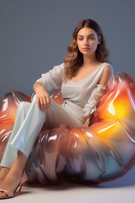 Capture a moment with Dezeen where a neo-Fauvist, inflatable sofa is the star. This piece of furniture is a nod to the future, with its fluid forms and futuristic bag design. The quiet atmosphere reflects off its high-tech, transparent surface, adding an elegant touch to its modern design. --ar 2:3 --s 250 --style raw --v 6.0