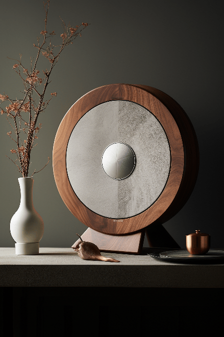 Visualize an organic handcrafted wooden speaker that captures the spirit of Wabi-sabi aesthetics. The speaker's main elements, such as the beautifully textured grain of the wood and the simple, round design, embody the essence of simplicity. The auxiliary elements, like the brass detailing, add a touch of luxury. Captured in natural light, this product is a testament to high-quality craftsmanship and eco-friendly design, rendered in stunning UHD --ar 2:3 --s 250 --style raw --v 6.0
