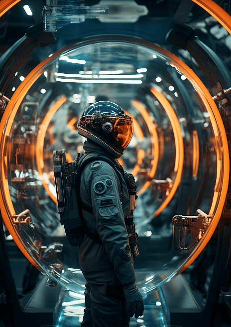 Inside a lavish, high-end designed spaceship, a reflection in a curved mirror shows an astronaut floating in zero gravity. The style is reminiscent of Stanley Kubrick's meticulous composition and James Cameron's mastery over sci-fi elements. The scene is presented from an asymmetrical composition, juxtaposing the spaceship's high tech interior with the astronaut's human vulnerability. --ar 5:7 --s 250 --style raw --v 6.0