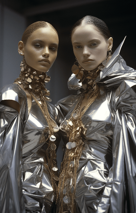 Dynamic fashion photograph of a trio of models in a triangular formation, each adorned in metallic couture, set against a raw, industrial backdrop. Medium: AnOther. Artist: Alexander McQueen --ar 9:14 --s 250 --style raw --v 6.0