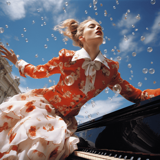 A model wearing Prada, her expressive pose mirroring the energy of a pianist at the height of a crescendo. Top view in Cosmopolitan by Tim Walker. --ar 1:1 --s 250 --style raw --v 6.0