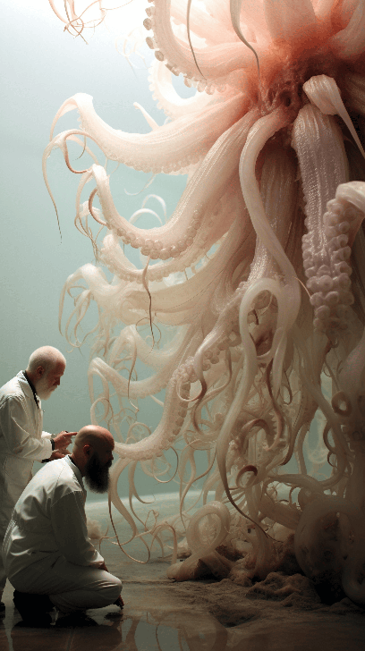 Dive into an epic scientific study of an exobiological specimen. This weird, yet fascinating scene portrays a close, ambiguous relationship between the researcher and the specimen. The inspiring wildlife macro photography, reminiscent of the works of Ernesto Neto, Vanessa Beecroft, Hermann Nitsch, and Jamie Hawkesworth, invites viewers to explore the unknown realms of exobiology. --ar 9:16 --s 250 --style raw --v 6.0